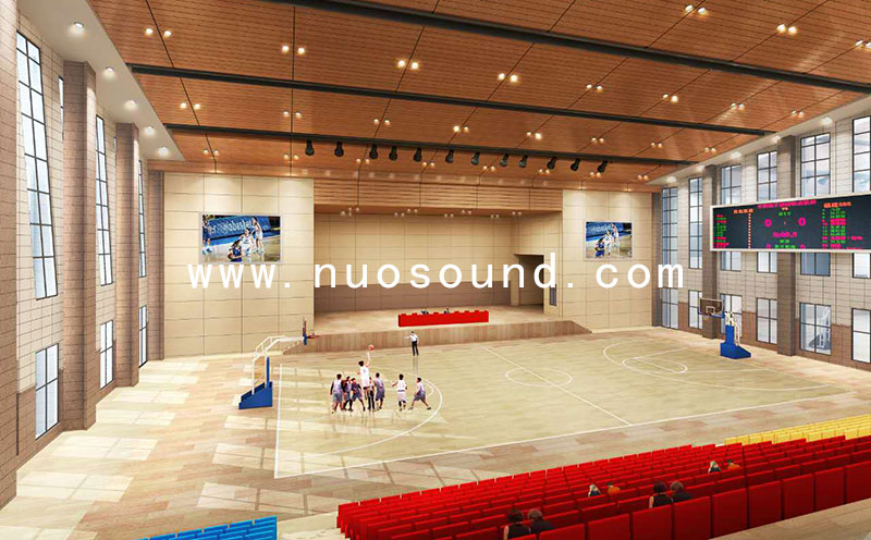 一般來說,多功能體育館建筑聲學設計的基本要求是要達到足夠的響度、滿意的清晰度、全場有比較均勻的效果以及無回聲干擾等物理缺陷,除了基本的設計之外,吸音材料的選擇也很重要。諾聲聲學向校方推薦的產品是諾聲體育館孔木吸音板。